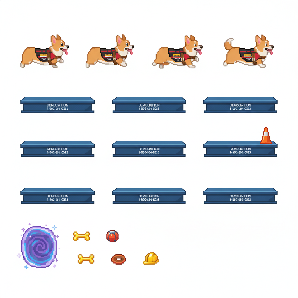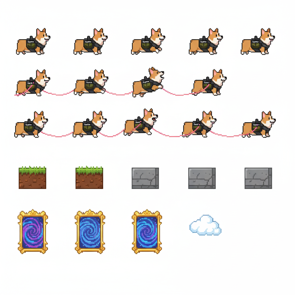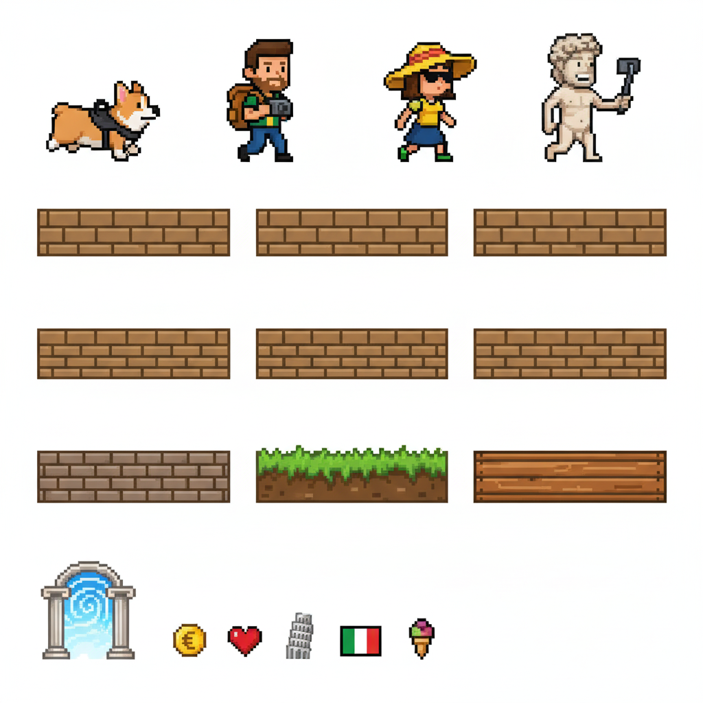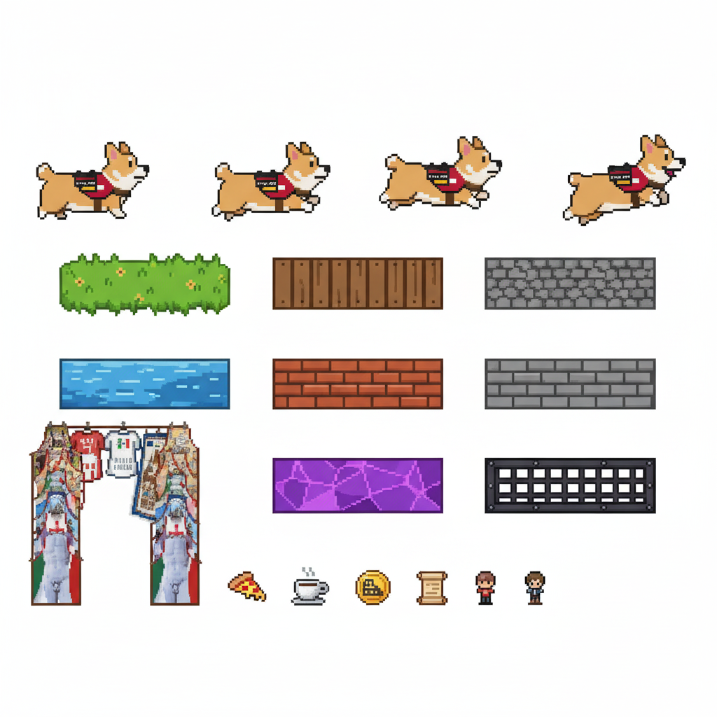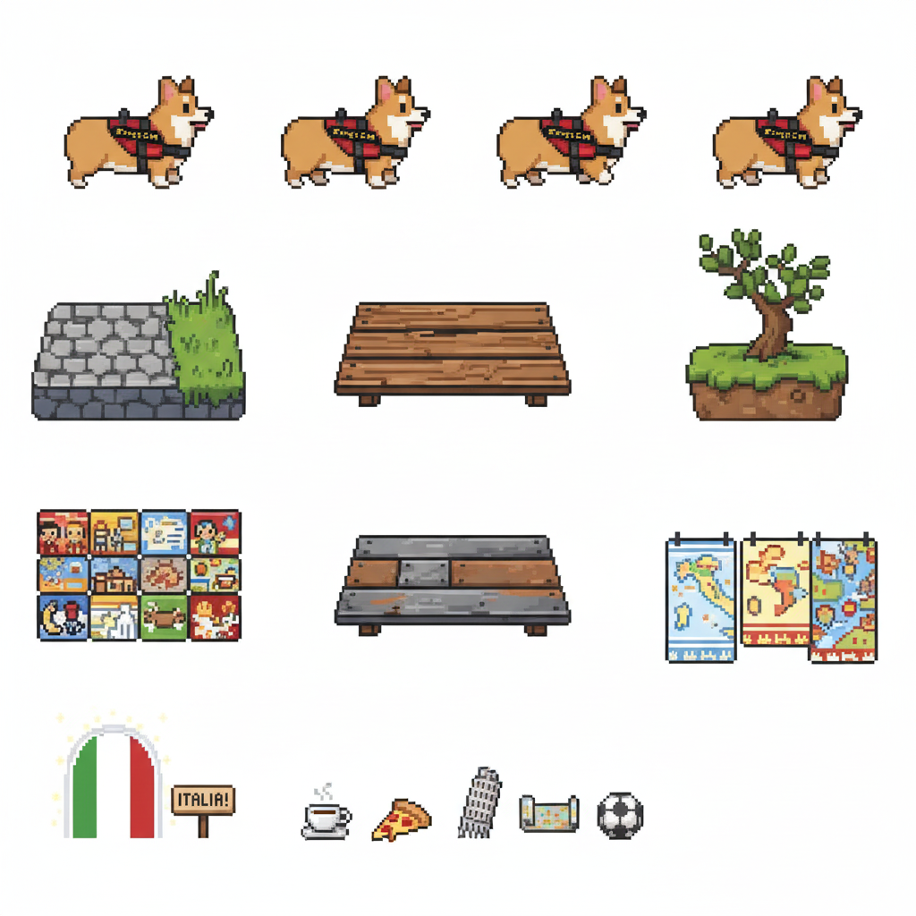 "sprite_selection_reasoning": "VISUAL ANALYSIS: panel_0-3 depict a Corgi dog (animation frames). panel_4 is a stone wall. panel_5 and panel_6 are wide wooden\/metal platforms. panel_8 is a tall structure (Leaning Tower). panel_10 is a wide element (Arch\/Sign). panel_11-15 are small items (coffee, pizza, etc.). CHOSEN: Player=panel_0 (Corgi). Goal=panel_8 (Tower) as it serves as a tall, visible landmark. Platforms=panel_5, panel_6, panel_10 (all wide\/landscape). Collectibles=Small items (panel_11, panel_12, panel_13, panel_14)."