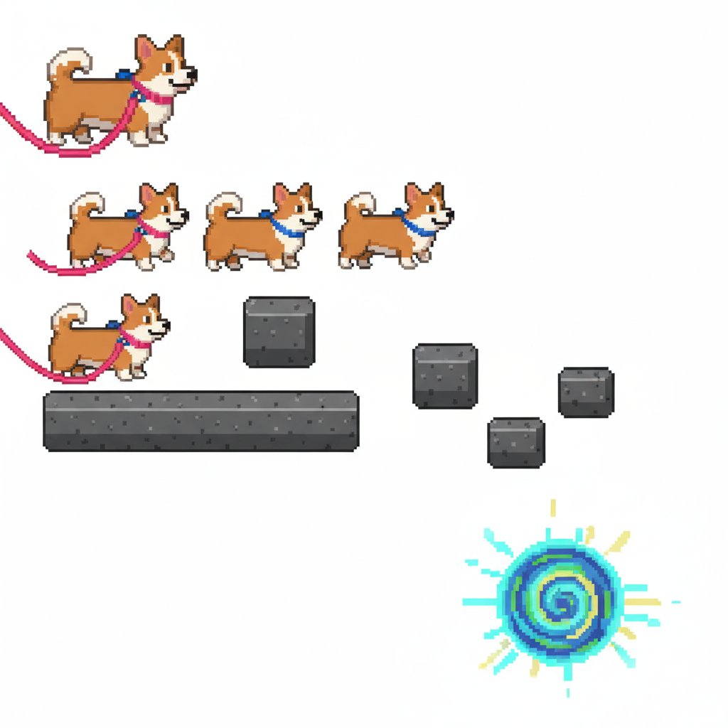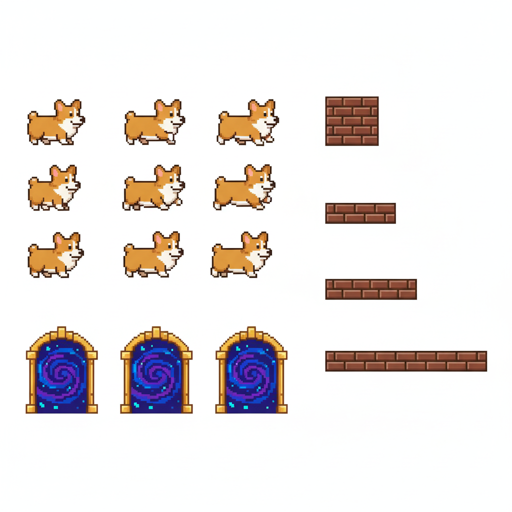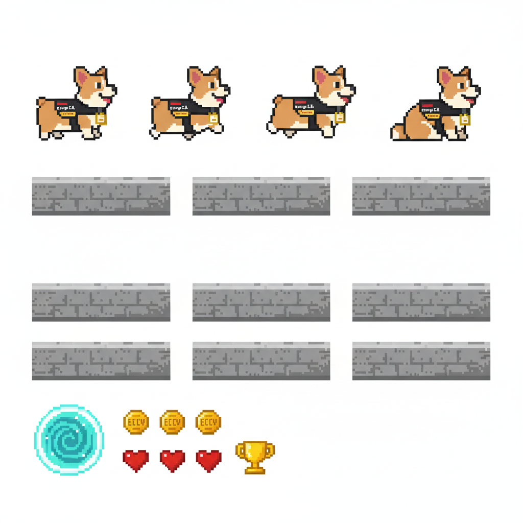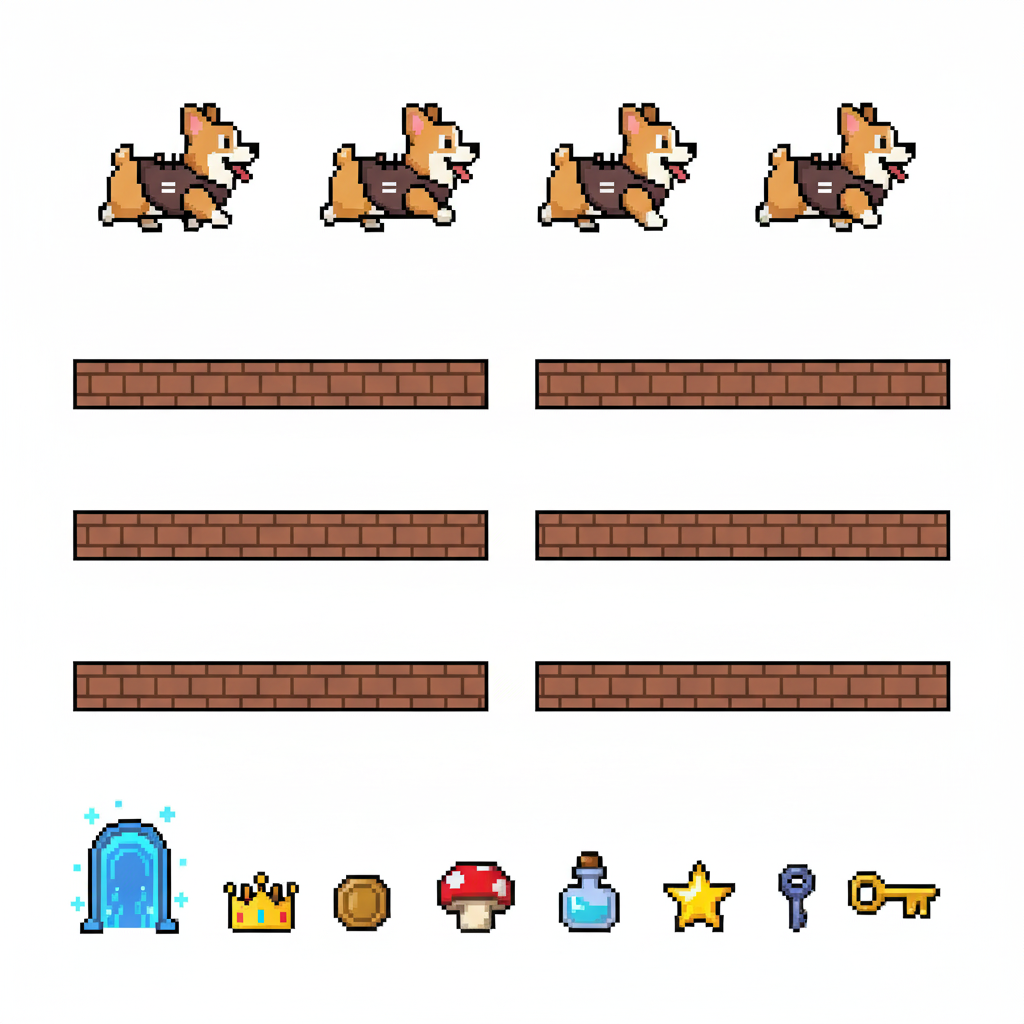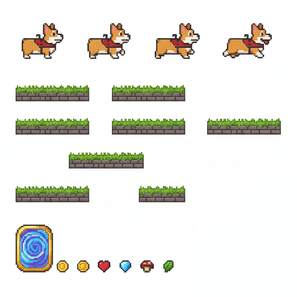"sprite_selection_reasoning": "VISUAL ANALYSIS: panel_0-3 depict a Corgi dog (animation frames). panel_4 is a stone wall. panel_5 and panel_6 are wide wooden\/metal platforms. panel_8 is a tall structure (Leaning Tower). panel_10 is a wide element (Arch\/Sign). panel_11-15 are small items (coffee, pizza, etc.). CHOSEN: Player=panel_0 (Corgi). Goal=panel_8 (Tower) as it serves as a tall, visible landmark. Platforms=panel_5, panel_6, panel_10 (all wide\/landscape). Collectibles=Small items (panel_11, panel_12, panel_13, panel_14)."