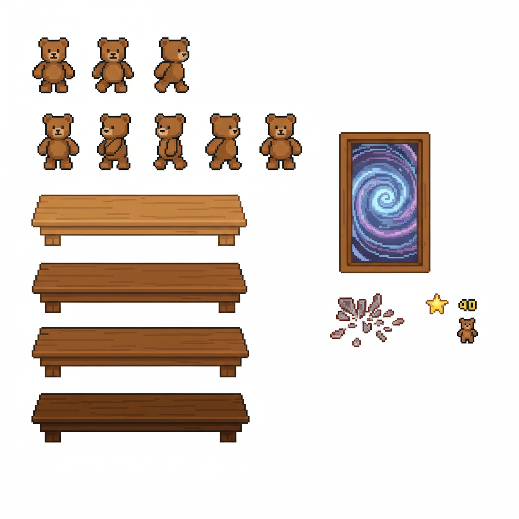 "sprite_selection_reasoning": "panel_4, panel_5, and panel_6 depict variations of the teddy bear, suitable for character animation. panel_8 shows the full character, but the smaller version fits the level better. panel_1 represents the window into the character's mind."