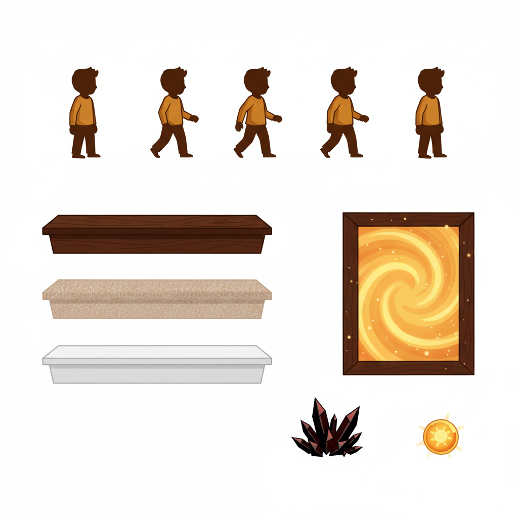 "path_choices": "The easier path has fewer hazards and more platforms, representing a simpler acceptance of loss. The harder path forces confronting more fears and collecting more fragments, symbolizing a deeper emotional journey.",