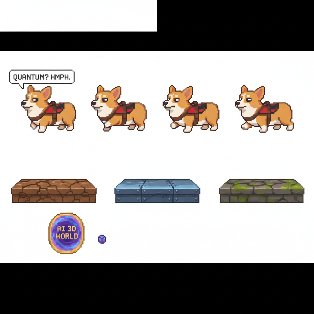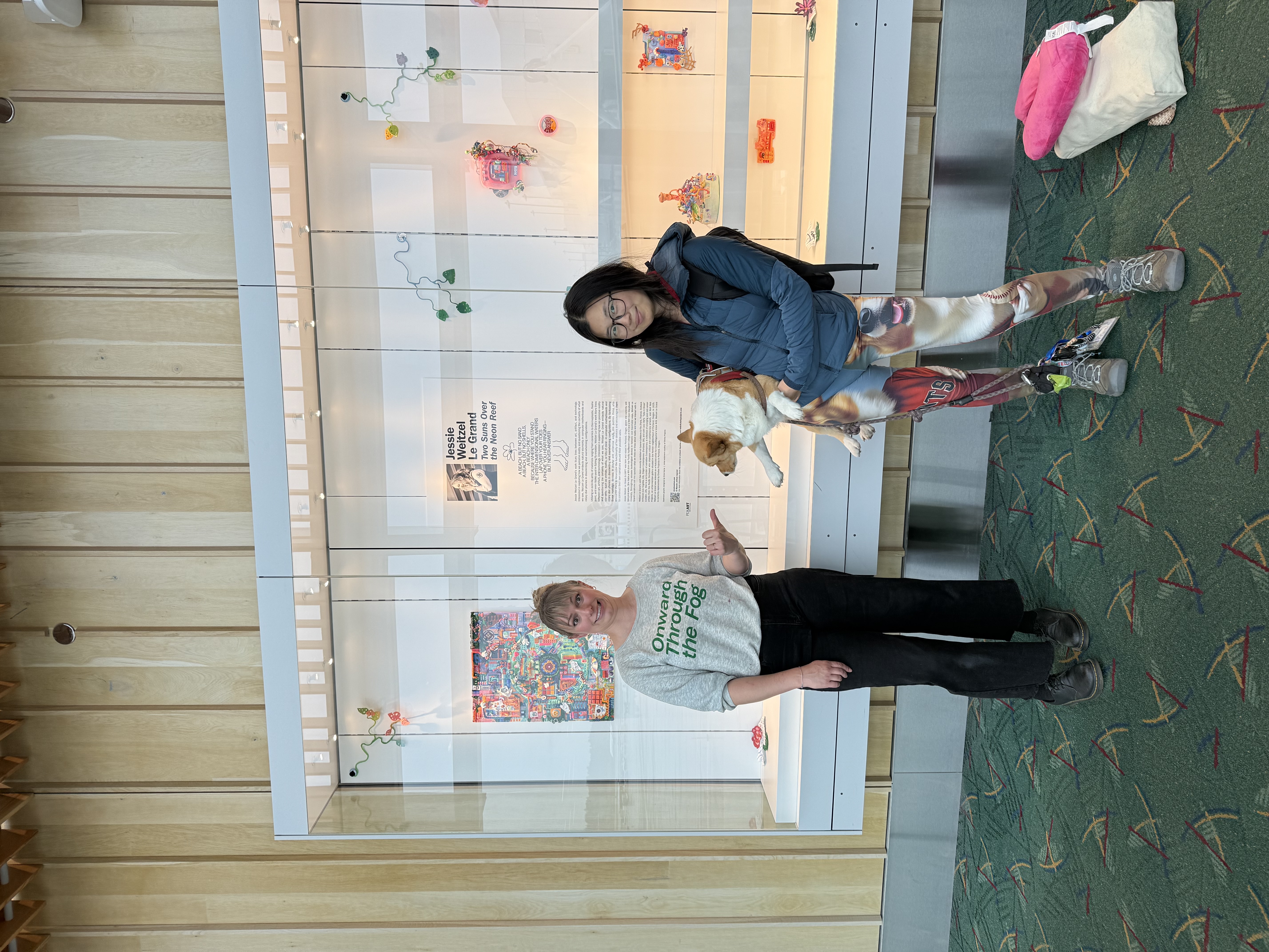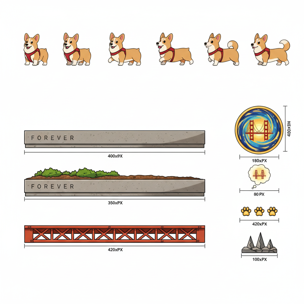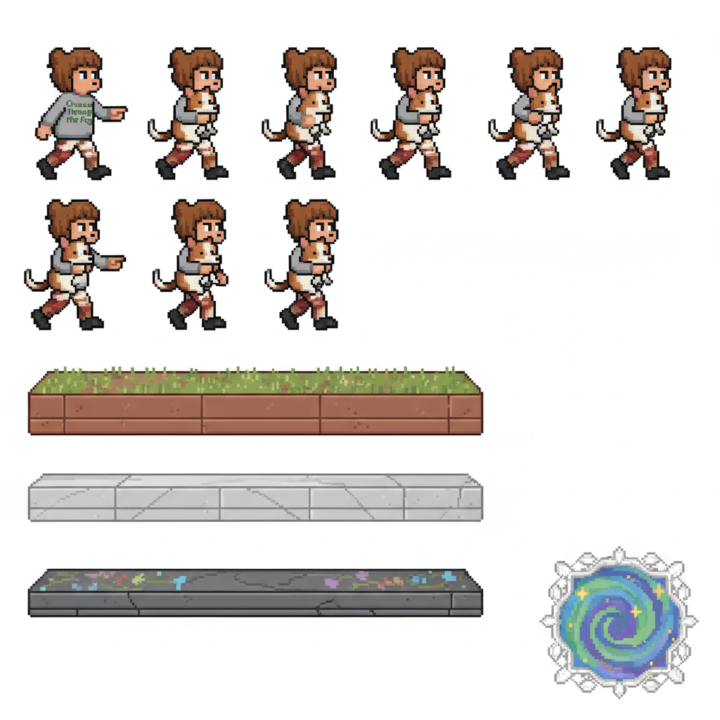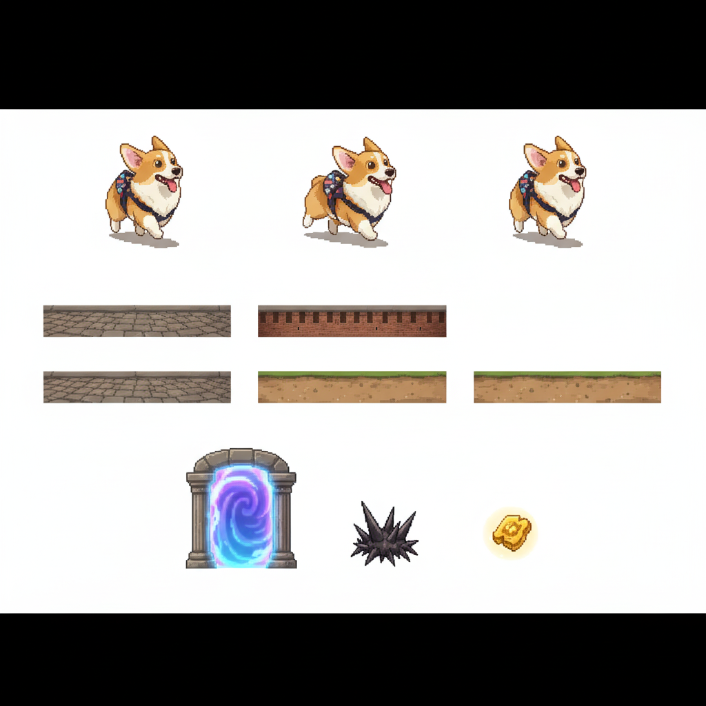 "sprite_selection_reasoning": "The tall player sprites are corgis on leashes and the goal sprite is a galaxy-like swirl that fits the theme of art and museums."