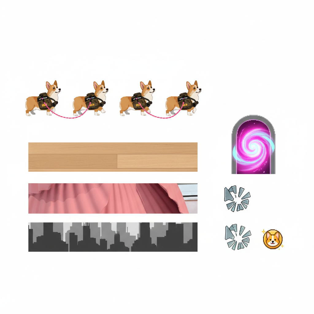 "player_identity": "The corgi, representing a small, loyal, and persistent part of the self navigating a challenging environment.",